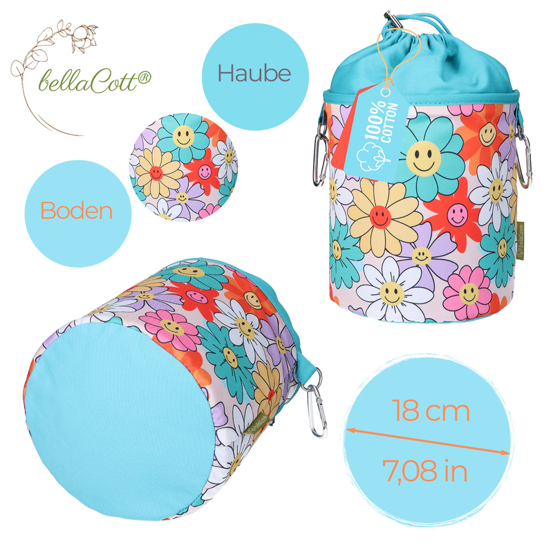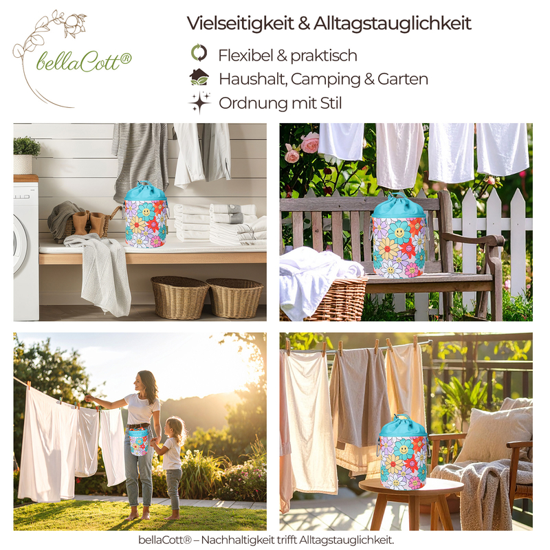 FARBEN UND DESIGN - Farben Wäscheklammern Klammerkörper: Indigo - Griffe: Grau - Maße: Länge x Breite: 70 x 22 mm; bellaCott Klammerbeutel Design: Seitenwände: farbenfrohe Blumen Smileys, Boden: Blau, Haube: Blau; Der obere Rand ist extra verstärkt. Maße/Durchmesser/Höhe: 18 cm x 21 cm + 10 cm verschließbare Haube mit Kordelzug, Gewicht: 130 g, waschbar bei 40 Grad, für Trockner auf niedriger Stufe geeignet, bitte vor dem Waschen die Haken entfernen, von links bügeln und waschen!