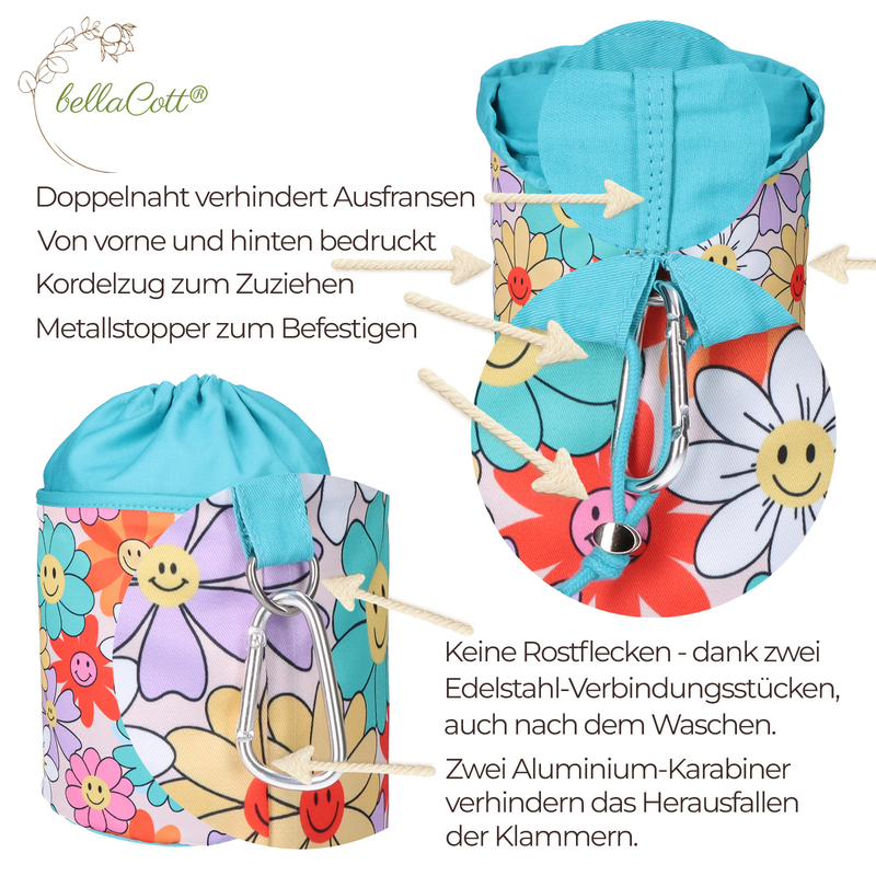 SETANGEBOT – Ein bellaCott Design Wäscheklammerbeutel Blumen Smileys und 48 indigo-graue Wäscheklammern mit Edelstahlfedern. Der Klammerbeutel ist mit der zuziehbaren Haube 31 cm groß, verfügt über zwei silberfarbene Aluminium-Karabinerhaken an den Seiten und einem Zugkordelverschluss mit Metallstopper, sodass die Klammern sicher verstaut sind und nicht aus dem Klammerbeutel herausfallen.