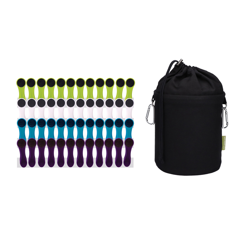 SETANGEBOT – Ein schwarzer bellaCott Wäscheklammerbeutel aus festem Canvas Stoff und 48 4-farbige Wäscheklammern mit Druckfedern aus galvanisiertem Stahl. Der Klammerbeutel ist extra groß und robust, verfügt über zwei silberfarbene Aluminium-Karabinerhaken an den Seiten und einem Zugkordelverschluss mit Metallstopper, sodass die Klammern sicher verstaut sind und nicht aus dem Klammerbeutel herausfallen.